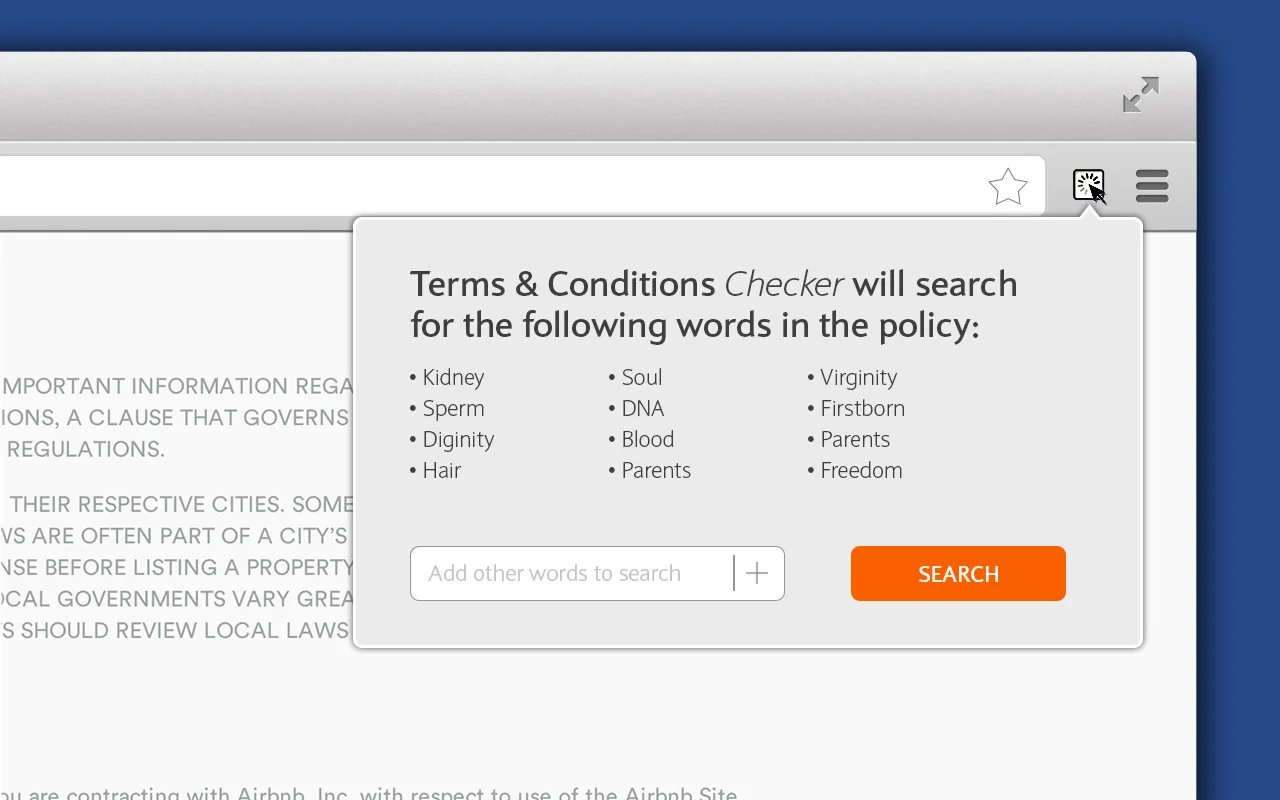 In a world where Terms and Conditions pages are increasing and font size decreasing the Google Chrome plugin was created to enables the user to type and search any words. It is imperative to understand what is in these lengthy and hard to read documents and we are accustomed to simply click accept without giving a second’s thought. Our rights and other hosts of things online depend on checking box.